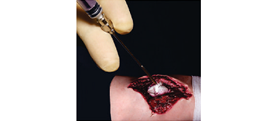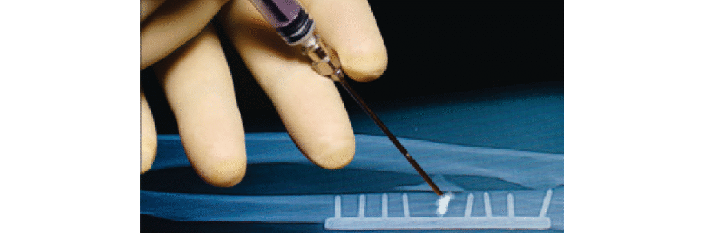Inject under C-arm visualization between and around ends of Precision. Depending upon the fracture you may have to use 10-50 gms of powder.